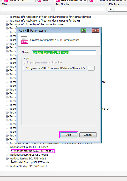 The FAQ documents contain parameter lists that have been put together by KEB Engineers to assist users with startups of advanced drive functions. Take, for example, KEB’s powerful sensorless closed-loop (SCL) functionality. SCL allows you to run a motor with closed-loop performance speed and torque control without the use of an encoder. This functionality requires you to input motor and control parameters which can be a daunting task if you are unfamiliar with VFD programming. The FAQ worklist available in Combivis 6 allows you to import a parameter list complete with comments to enter into your KEB VFD: