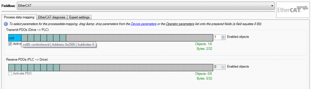 Setting up your EtherCAT process data is simply a drag-and-drop task in Combivis 6 VFD software. The process data wizard handles all of the addressing and once the user has picked all of the transmit and receive PDOs, they can export an XML file from Combivis 6 to load into the PLC.
