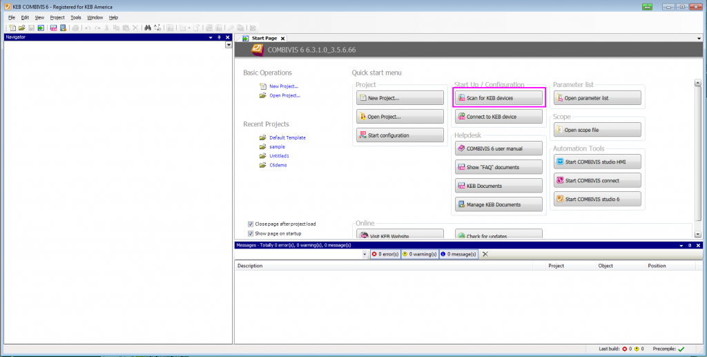 When troubleshooting a machine, the last thing you want is another problem to arise. For example, your PC will not communicate with your automation equipment. Instead of manually tweaking baud rates and COM ports to scan, Combivis 6 will scan a full range in search of a KEB device automatically. The KEB Device Scan function can be easily activated by clicking the “Scan for KEB devices” button on the start page of the software.