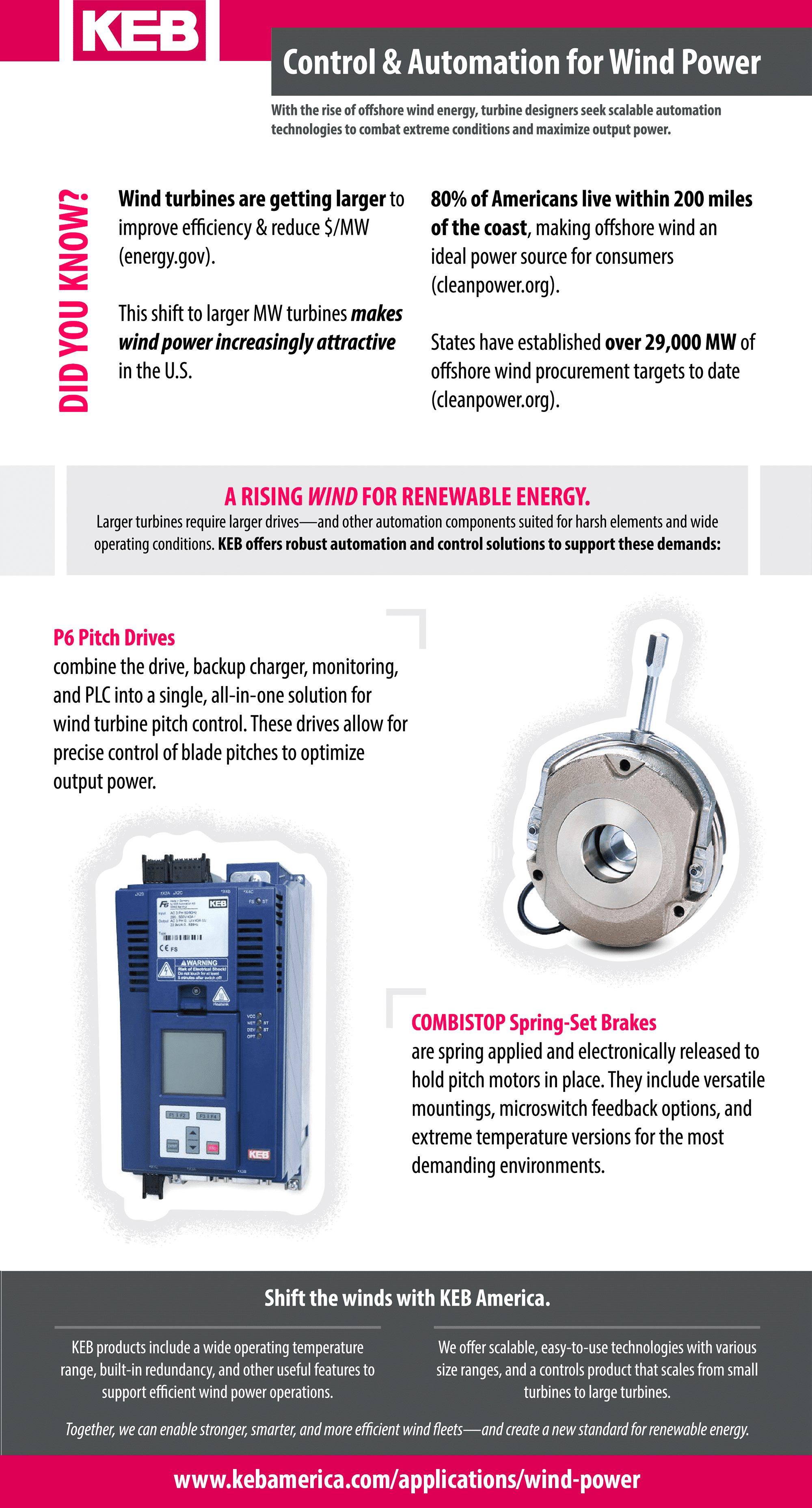 Larger turbines require larger drives—and other automation components suited for harsh elements and wide operating conditions. KEB offers robust automation and control solutions to support these demands: